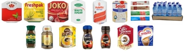 Wide range of teas, coffees, creamers, sugars, filtered water, soft drinks.